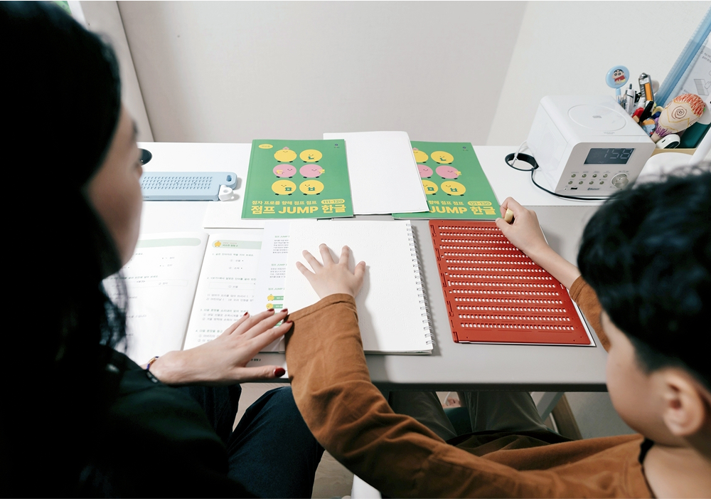또한, 단계별 점자 학습과 가정 내 교육을 위해, 총 200단계의 기초-기본-유창성-이해력으로 구성된 ‘일일 학습지 점프(Jump)’를 새롭게 개발했습니다. 점자는 매일 꾸준히 학습하는 게 중요한데요. 점프 일일 학습지는 매일 적정량의 학습을 도와 아동에게 성공 경험을 제공하고 부모와 아이가 함께 학습이 가능하다는 장점이 있습니다.